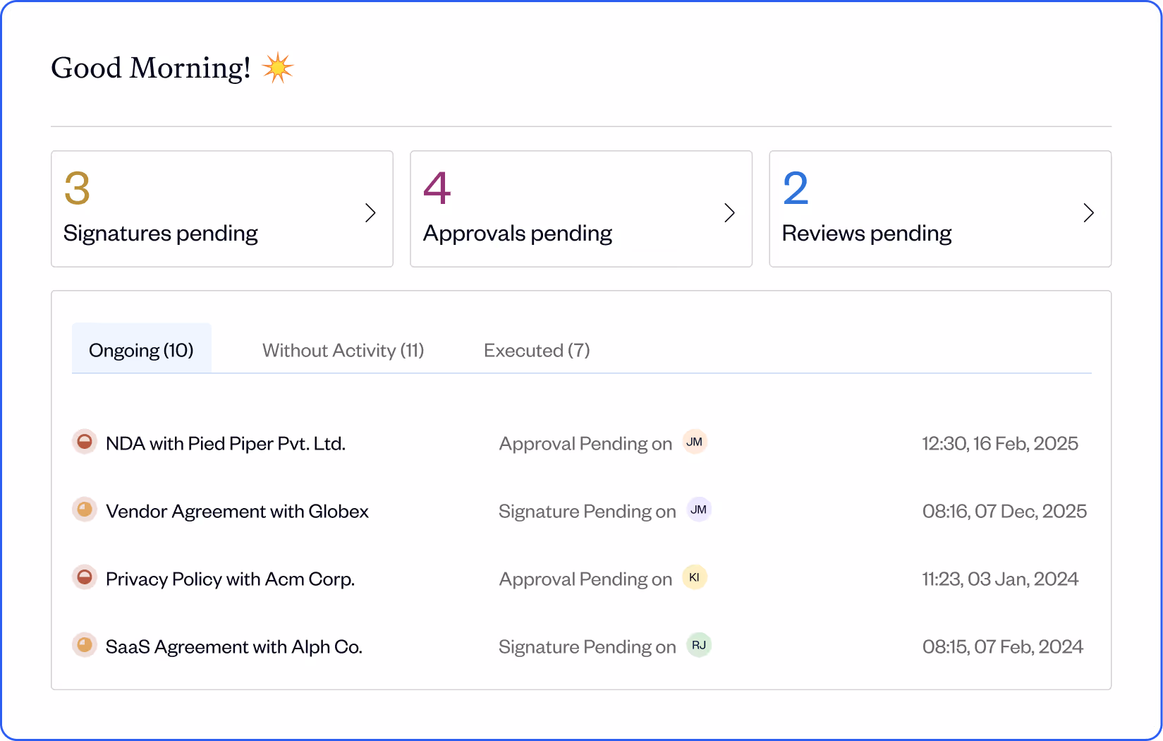 SpotDraft lets you send, sign, and store contracts in one place—fully compliant with major global standards like ESIGN and EIDAS.