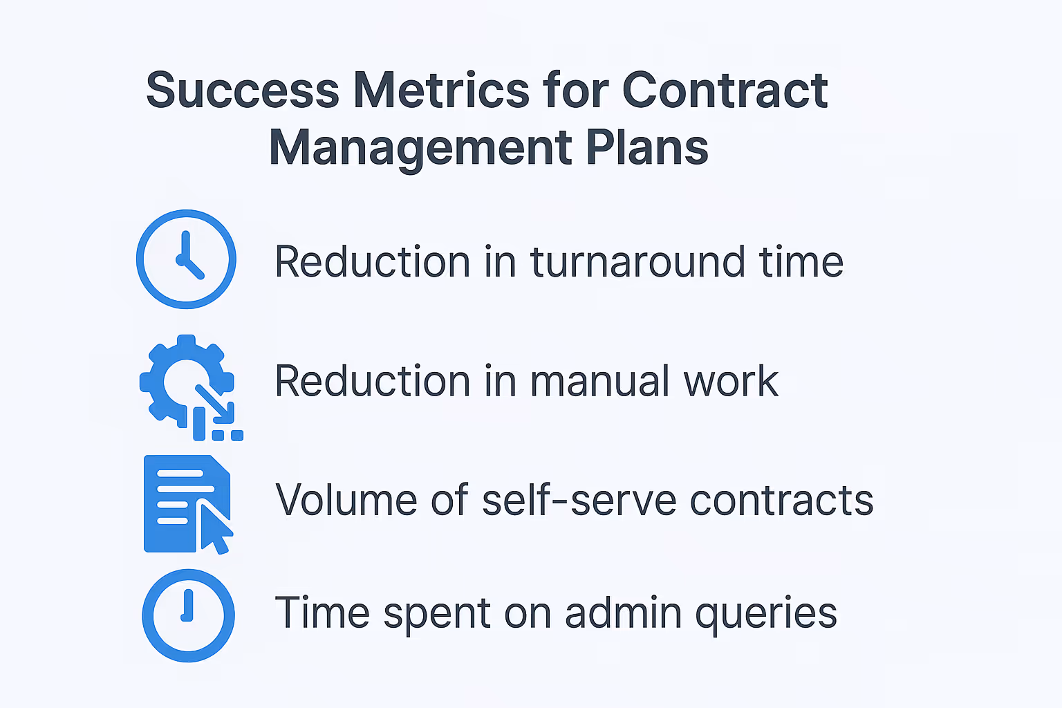 Success should be measured both in terms of legal efficiency and business impact. Some of the most useful metrics include: