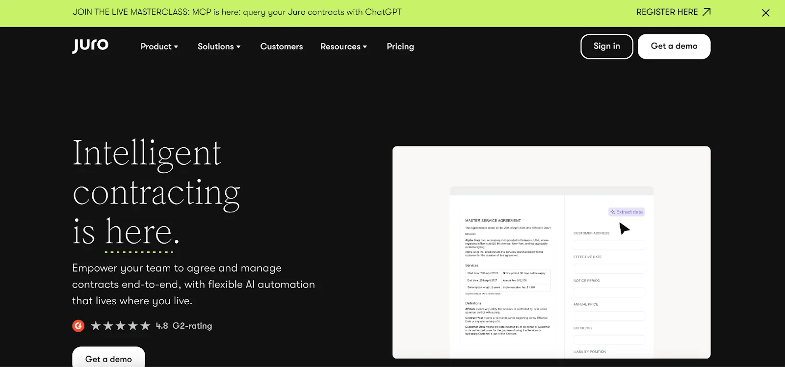 Juro is a cloud-based Contract Lifecycle Management (CLM) platform designed to embed AI contract automation directly into the daily workflows of business teams. It streamlines negotiation, drafting, approval, and e-signing, everything within a secure, browser-native environment.