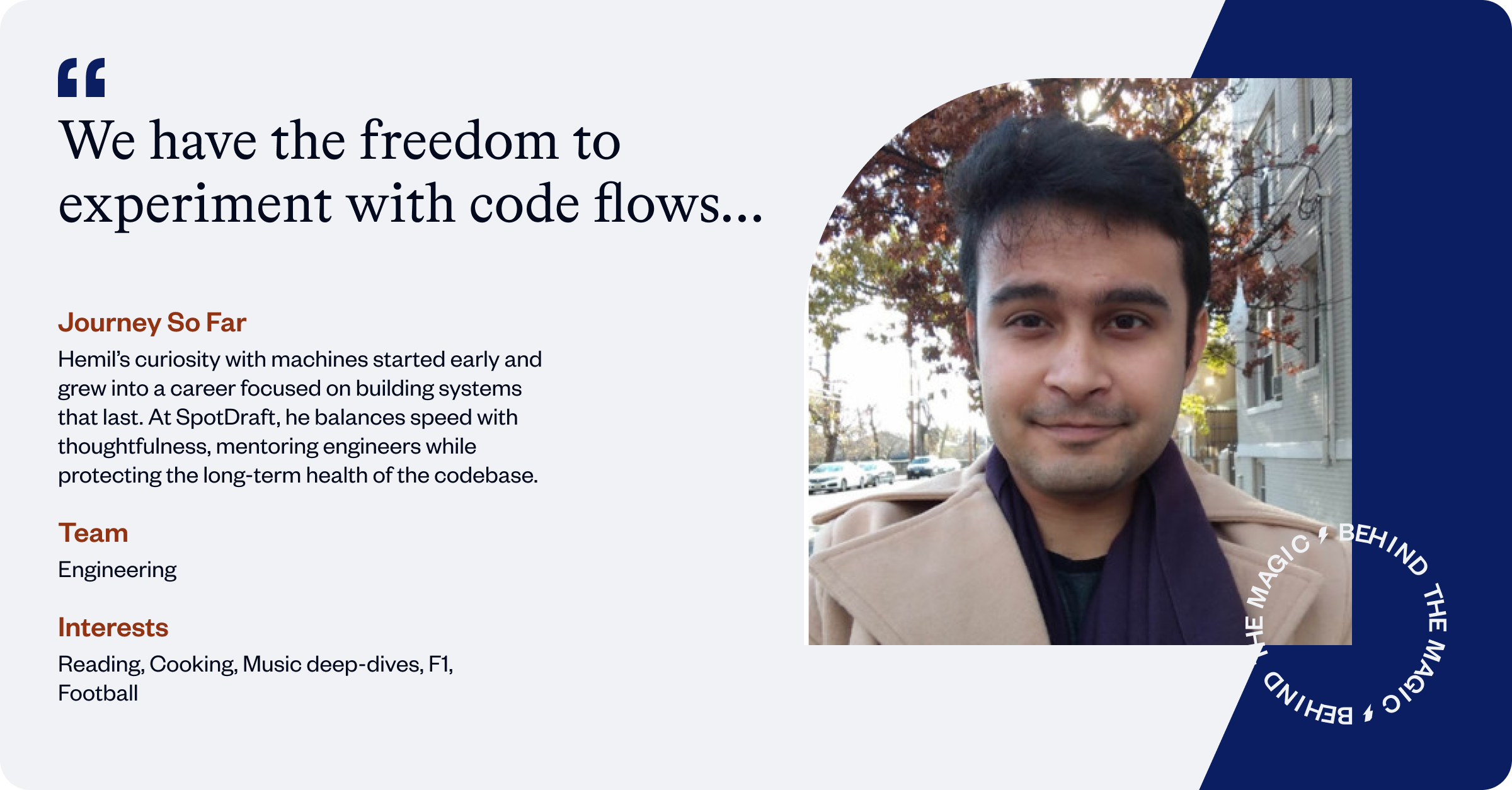 From navigating the chaotic streets of Bangalore to helping scale SpotDraft’s engineering foundations, Hemil’s nearly four-year journey has been defined by a "safety net" leadership style, enabling the juniors, and a relentless focus on long-term code health. As a Senior Developer, he balances the urgency of delivery with the discipline of thinking through the consequences of every technical decision.