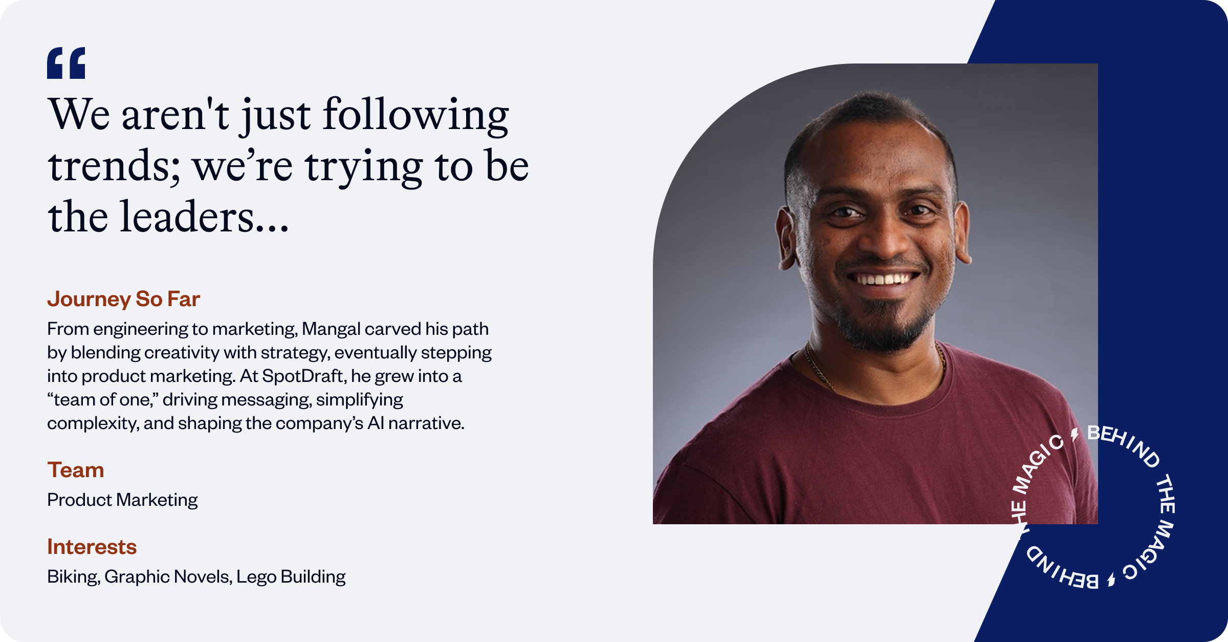 In this edition of Employee Spotlight, meet Mangal Joe Edwin, Product Marketing Manager (PMM) at SpotDraft. From creating India’s first pump track to navigating the "god-like" workloads of a rapidly scaling startup, Mangal’s two-and-a-half-year journey has been a masterclass in tactical execution, first-principles thinking, and the art of keeping things simple in a complex market.