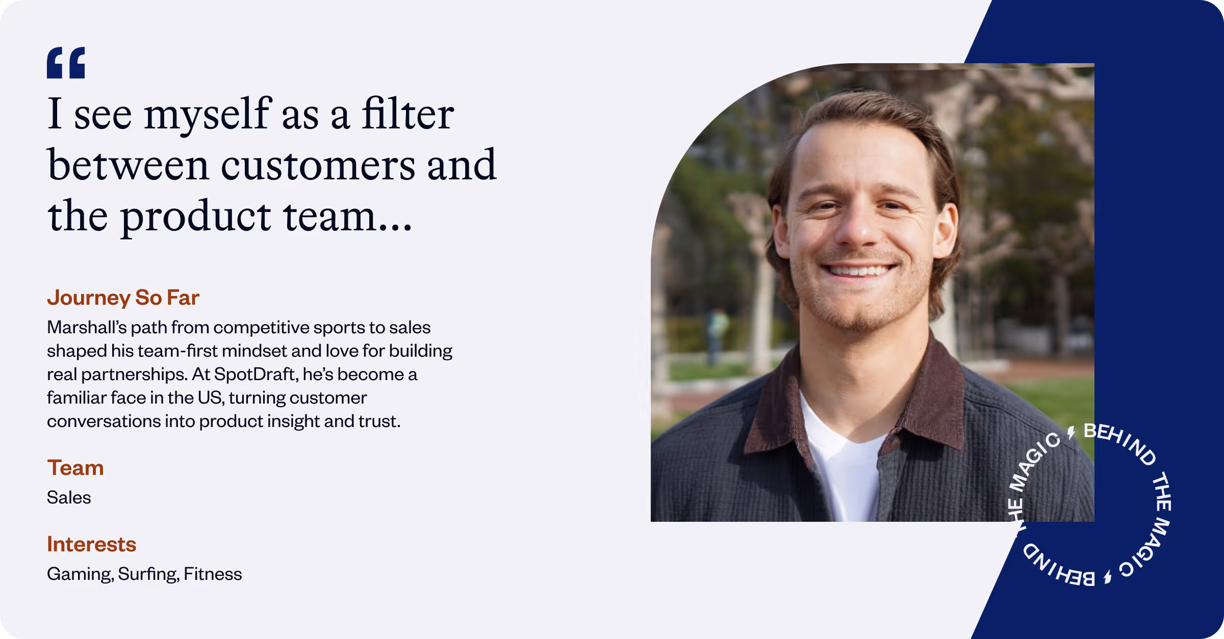 In this edition of Employee Spotlight, meet Marshall, a key player in SpotDraft’s US-based sales team. From being a college football athlete and a personal trainer to becoming a "face of the business" in San Francisco, Marshall’s journey is a testament to the power of competitiveness, empathy, and the pursuit of a true partnership.