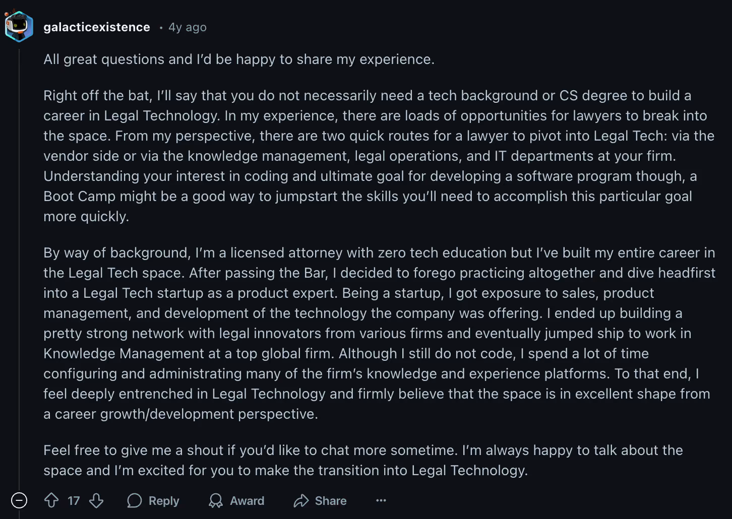 There are countless Reddit threads where successful transitions into legal ops happened because someone dared apply to a startup role. Startups give you room to learn by doing.