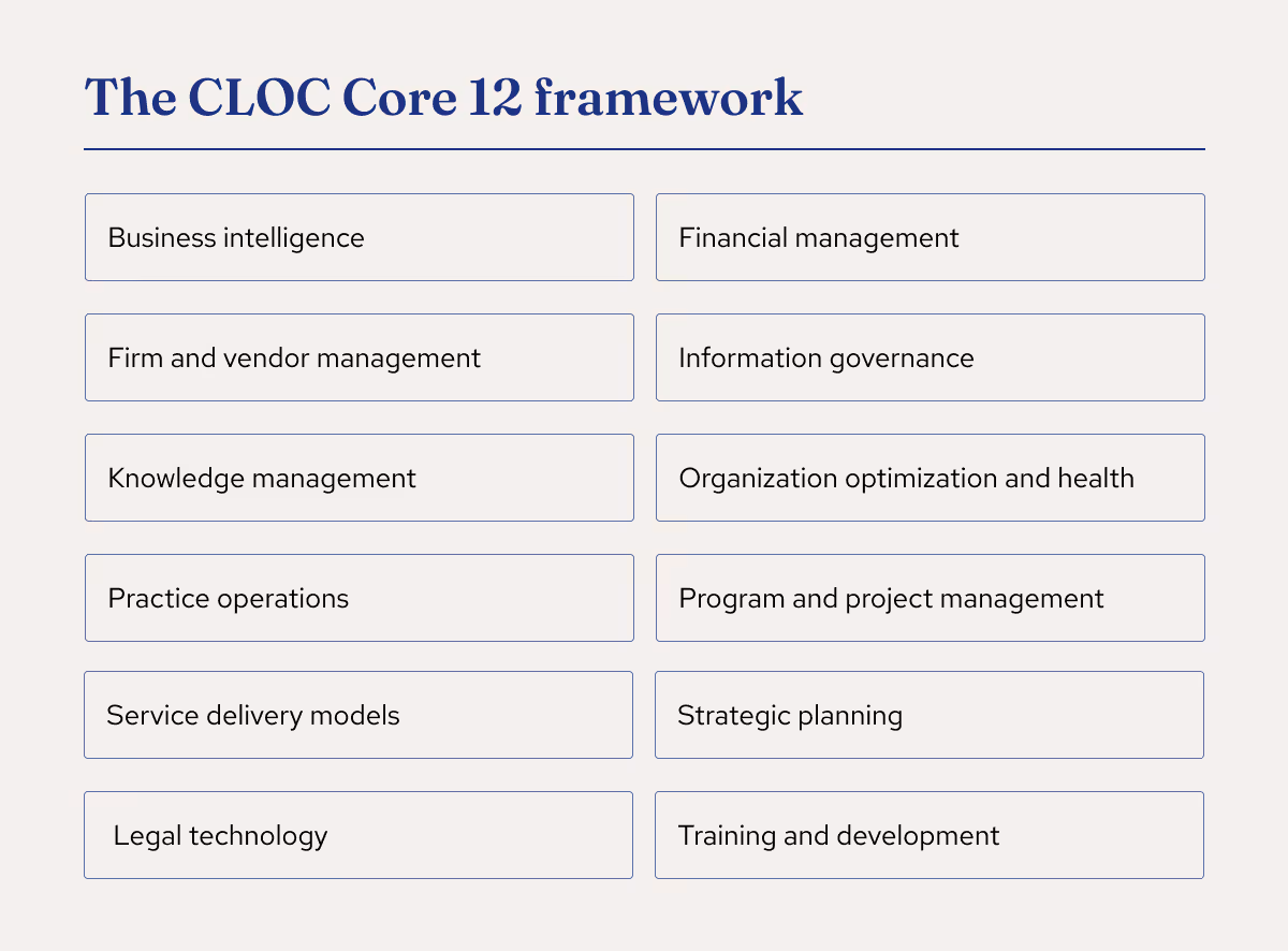- CLOC Core 12: Created by the Corporate Legal Operations Consortium, this is the gold standard in legal ops education. You’ll learn the fundamentals like financial management, vendor management, tech strategy. Check it out here