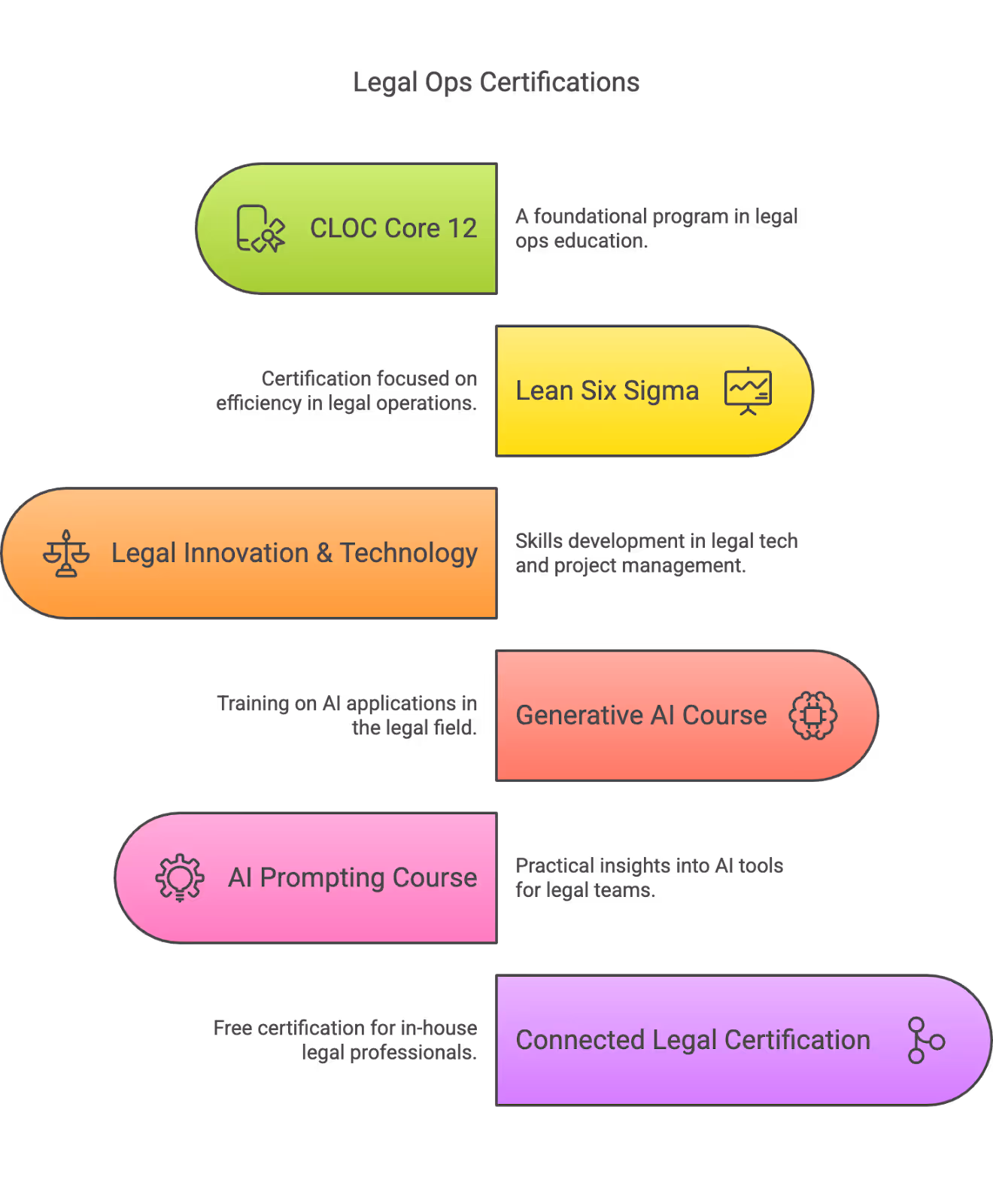 - Certifications in project management and legal process management, or courses from groups like CLOC (Corporate Legal Operations Consortium) can be particularly valuable for signaling expertise and dedication