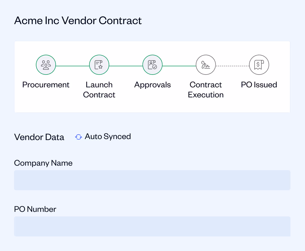 Key contract and supplier details — such as vendor name, purchase order, value, and status — sync bi-directionally, ensuring both systems remain up to date and accurate.