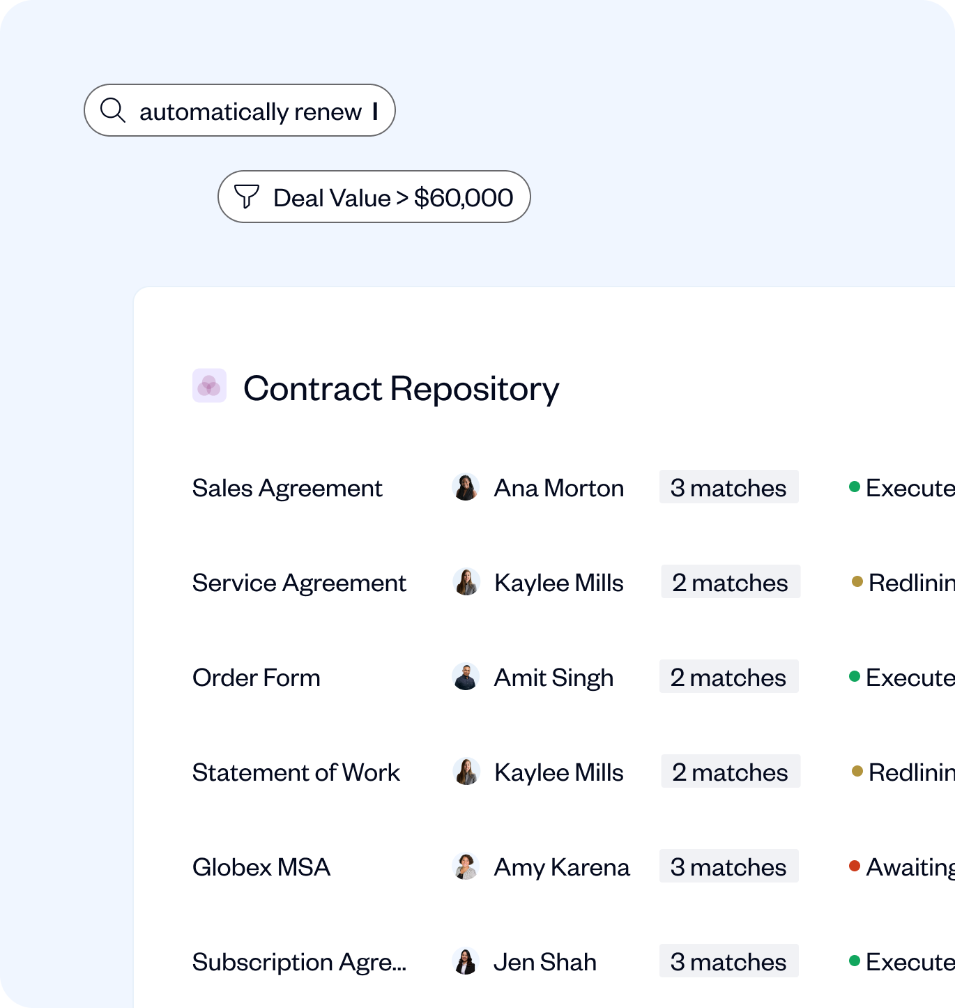 SpotDraft Repository centralizes all of your contracts and automatically pulls over 1000 types of contract metadata using AI so you can access, organize, and search your contracts easily.