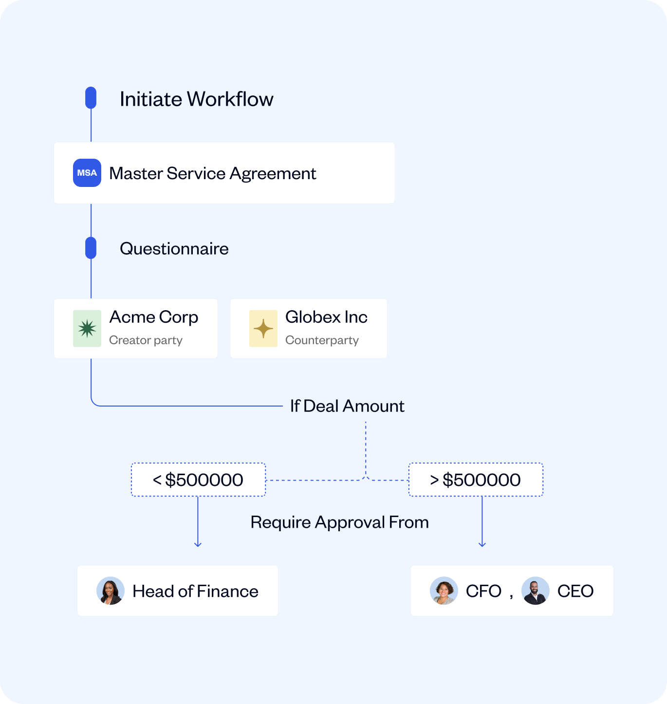 Create your own workflows to automate key legal processes like contract creation, reviews, and approvals – no technical expertise required.