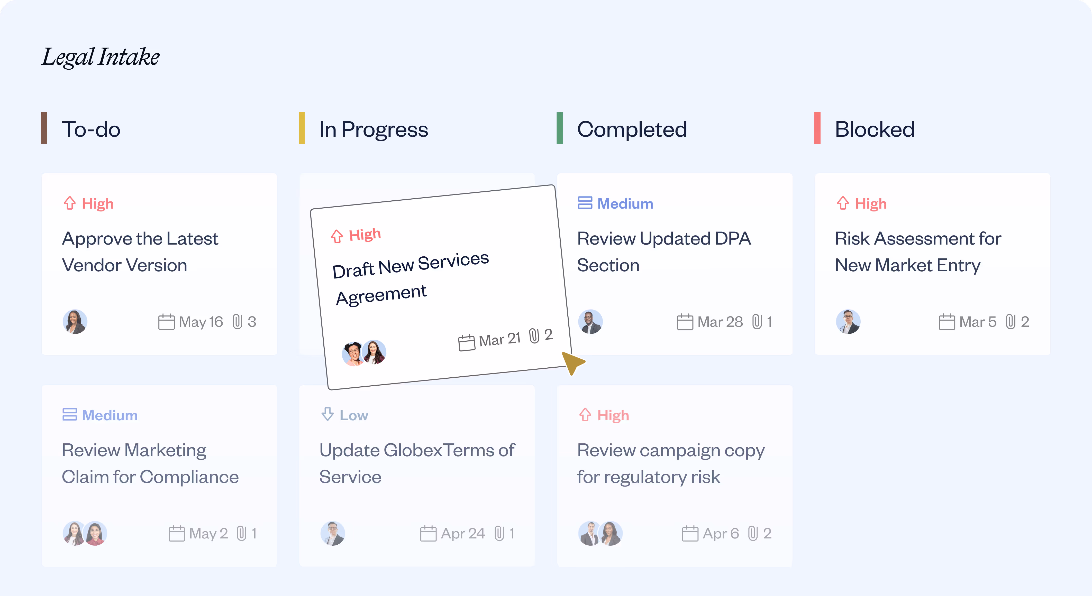One place to capture, prioritize, assign, and track requests so Legal keeps the business moving